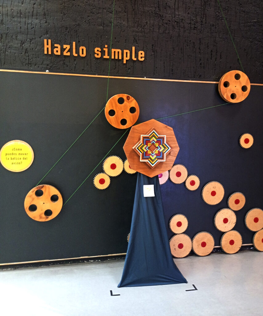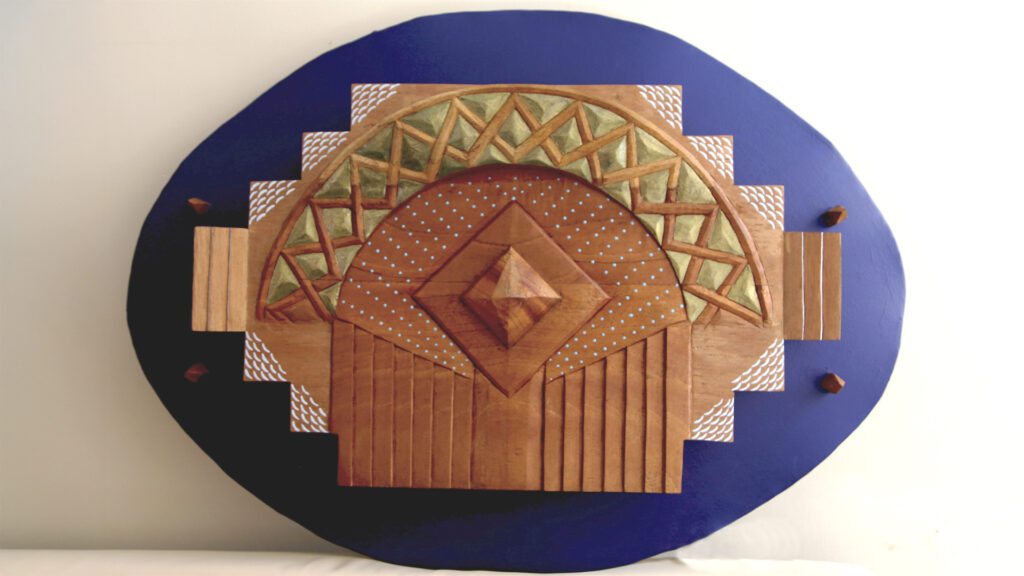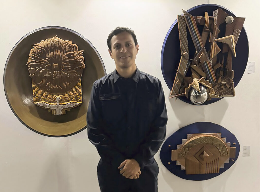 La madera de cedro es el elemento primario en la obra de Fran DaMor, pero no es el único. También incorpora acabados en óleo, cuadros, piedras y metales que provienen de su exploración del arte Wixárica.